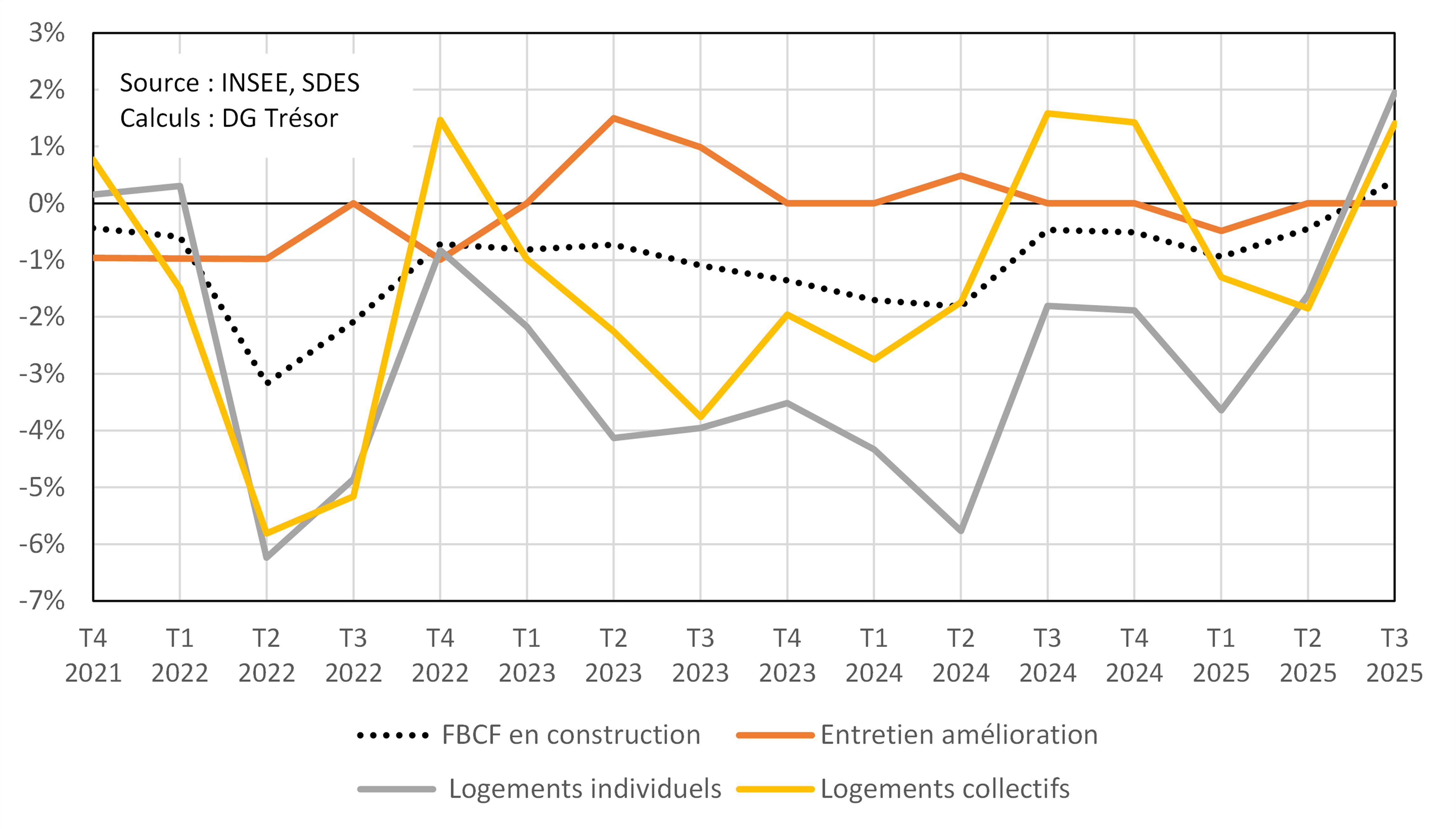 La reprise observée chez les ménages s'explique principalement par le redémarrage de la construction résidentielle neuve. La construction de logements individuels et collectifs a progressé au troisième trimestre, tandis que l'activité d'entretien-amélioration est restée globalement stable.