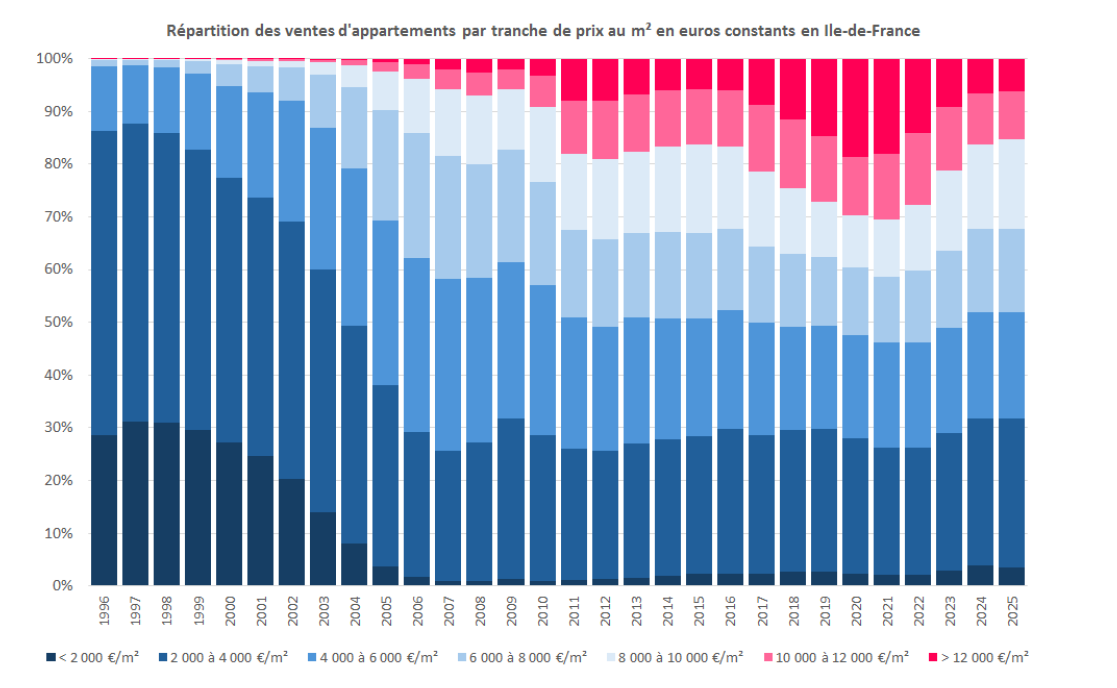 Avant 2003, ces tranches oscillaient entre 1 % et 13 % des transactions. Les ventes dépassant 10 000 euros le mètre carré, inexistantes avant 2002, ont connu une progression continue jusqu'en 2021, atteignant alors 31 % des ventes régionales. Bien qu'en recul depuis 2022, elles pèsent encore 15 % du marché en 2025.