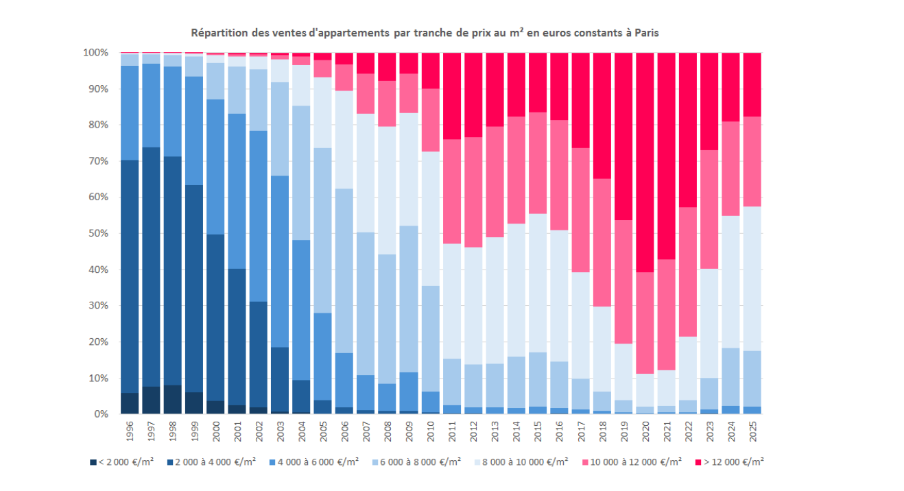 Longtemps marqué par une diversité de niveaux de prix, le marché des appartements à Paris s'est progressivement concentré sur les segments les plus élevés. Les ventes conclues à moins de 4 000 euros le mètre carré, encore largement majoritaires jusqu'au début des années 2000, ne représentent plus qu'une part marginale des transactions depuis près de vingt ans.